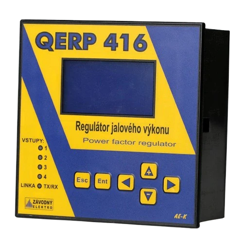 Regulátor QERP je určen pro kompenzaci účiníku sítě a je vybaven vstupem pro připojení vysílacích elektroměrů rozvodných závodů ( AEG, Landis apod.). Pro připojení impulsních elektroměrů se používají aktivní paralelní vstupy P (činný), Q (jalový ind) i (jakový kap). Výstupy regulátoru jsou realizovány pomocí spínacích relé 250V/5A AC. Dodáván je ve verzi s 8 nebo 16 výstupy. Libovolné stupně lze volit jako kapacitní (kondenzátory) a indukční (dekompenzační tlumivky).